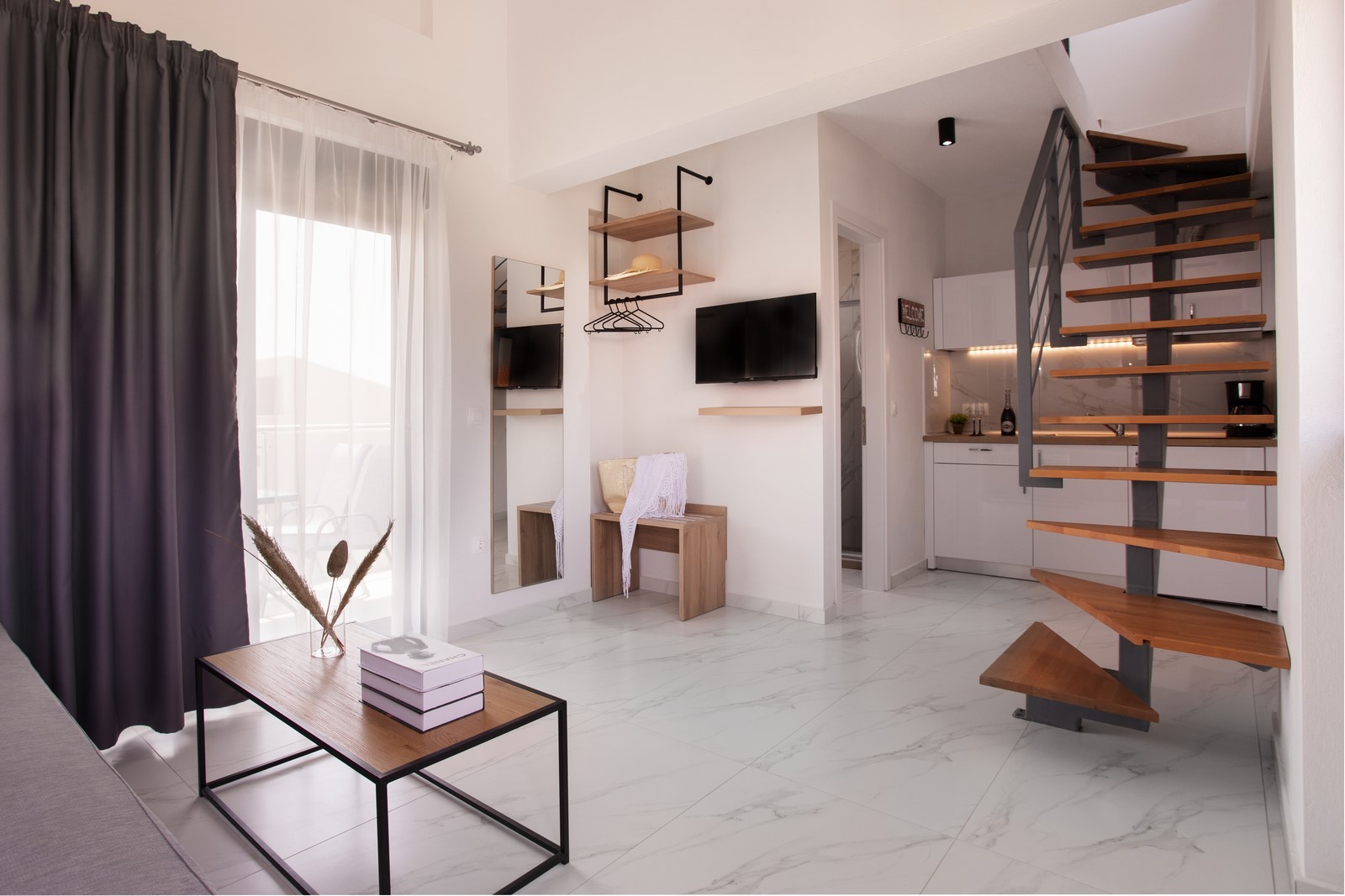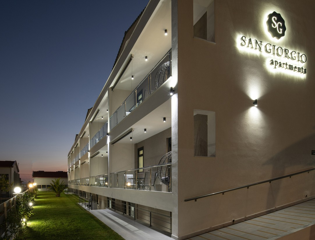 San Giorgio Apartments just 300m distaned from the beautiful beach of Nikiti. The accommodation has 12 apartments designed with unique and modern aesthetics which can accommodate up to 4 persons each. We promise you the experience of a lifetime to those who share a love for both the mountain and the sea. Every room has all the necessities to offer you a comfortable and pleasant stay. In a matfer of 5 minutes you can go on a week and find yourself in the bustling pedestrian area of Nikiti whish offers a variety of options for entertainment and fun for all tastes. The closest airport is in Thessaloniki and it is accesable in 88 klm from the apartments